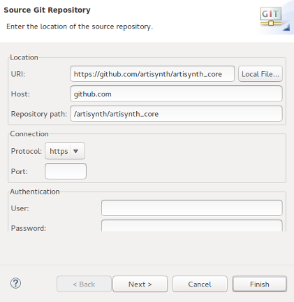 A Source Git Repository dialog will appear (Figure 3, left). Enter the URL for the repository. For ArtiSynth itself, this is https://github.com/artisynth/artisynth_core.git). The URI field is coupled to some of the others: you can either fill in the URI field directly, or enter the individual URI components in the Host, Repository path, and Protocol fields. Also, if the repository has read access restrictions, it will generally be necessary to specify a user name and password in the Authentication fields. After entering the required information, click Next.