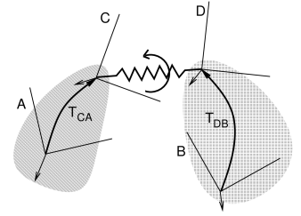 where pCA gives the connection point of body A with respect to frame A, TDB gives the transform from frame D to frame B, and TDW gives the transform from frame D to world.