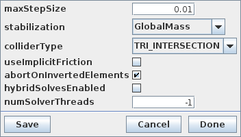 Simulation settings involve attributes related to model simulation. They can be adjusted by selecting “Simulation ...” from the Settings menu, which opens a simulation settings dialog (Figure 52). Clicking the Save button will save the current settings to the user’s preferences (Section 11.2) so that they will be set automatically when ArtiSynth is restarted.